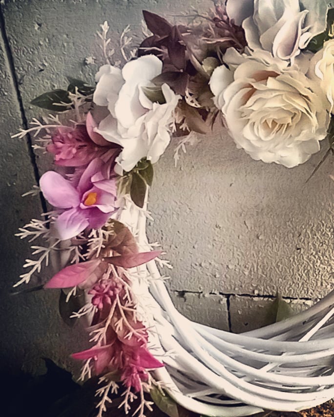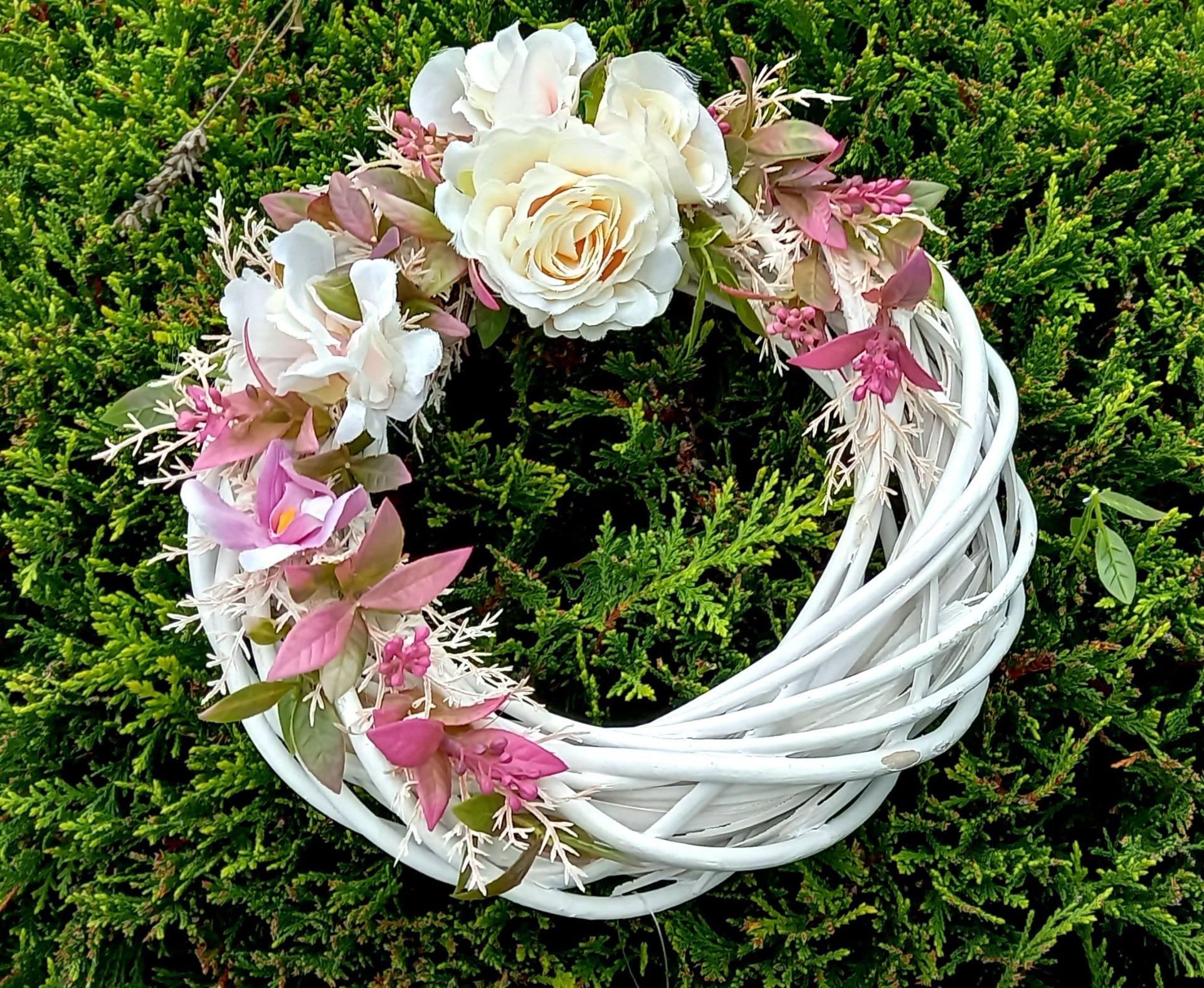 Romantický věnec Věnec s dominancí růže v přírodním odstínu doplněno o růžové drobné květy a větvičky Na korpusu z bílého proutí